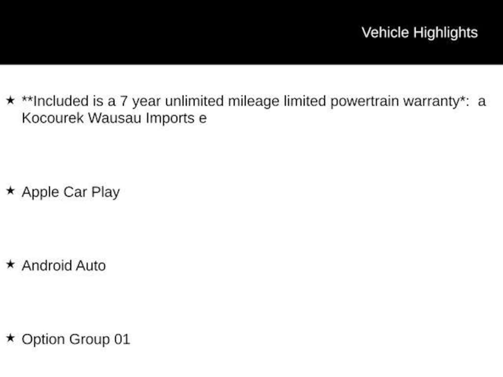 **Included is a 7 year unlimited mileage limited powertrain warranty*: a Kocourek Wausau Imports e, Apple Car Play, Android Auto, Option Group 01, 16" x 6.5J Aluminum Alloy Wheels, 4-Wheel Disc Brakes, 6 Speakers, ABS brakes, Air Conditioning, All-Season Fitted Liners, Alloy wheels, AM/FM radio: SiriusXM, Apple CarPlay & Android Auto, Auto High-beam Headlights, Brake assist, Bumpers: body-color, Cargo Block, Cargo Tray, Carpeted Floor Mats, Cloth Seating Surfaces, Delay-off headlights, Driver door bin, Driver vanity mirror, Dual front impact airbags, Dual front side impact airbags, Electronic Stability Control, Emergency communication system: Bluelink+, Exterior Parking Camera Rear, First Aid Kit, Four wheel independent suspension, Front anti-roll bar, Front Bucket Seats, Front Center Armrest, Front reading lights, Fully automatic headlights, Illuminated entry, Knee airbag, Low tire pressure warning, Occupant sensing airbag, Outside temperature display, Overhead airbag, Overhead console, Panic alarm, Passenger door bin, Passenger vanity mirror, Power door mirrors, Power steering, Power windows, Radio data system, Radio: AM/FM/HD/SiriusXM, Rear anti-roll bar, Rear side impact airbag, Rear window defroster, Remote keyless entry, Security system, Speed control, Speed-sensing steering, Speed-Sensitive Wipers, Split folding rear seat, Steering wheel mounted audio controls, Tachometer, Telescoping steering wheel, Tilt steering wheel, Traction control, Trip computer, Variably intermittent wipers, Option Group 01.